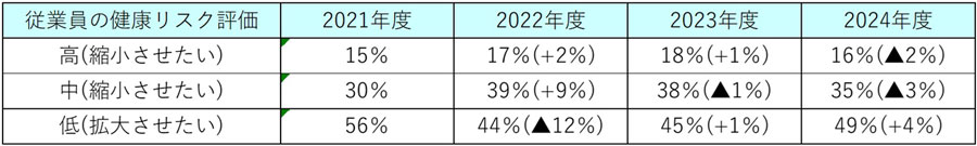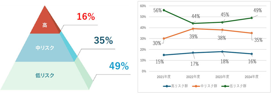 当社では2021年度から、生活習慣に関する傾向の見える化や健康意識を高めている要因・阻害している要因の把握等を目的として、全従業員を対象とした「健康習慣アンケ―ト」を実施しています(2023年度の回答率:95%)。調査結果から従業員の健康リスクを高、中、低の三群に分類し、高・中リスク群を引下げ、低リスク群を拡大することで、経営課題である「従業員の健康状態および健康に対する意識の改善・向上」「生活習慣や病気・ケガ、メンタルヘルス不調による生産性低下の防止」につなげていく方針です。