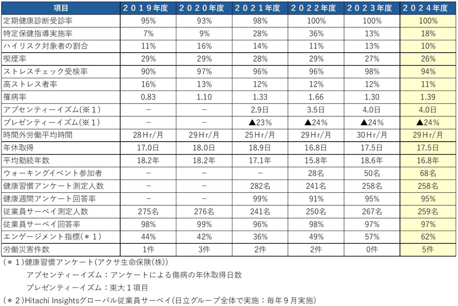 なお、毎年従業員に対する意識調査(Hitachi Insights)を実施していますが、エンゲージメント指標はここ数年改善傾向にあり、2024年度肯定的回答結果として62.0P(2023年度:56.8P(+5.2P))となっています。健康経営の取り組みを通じて「安全・健康・快適で働きやすい職場」を構築し、エンゲージメント指標のアップにもつなげていきたいと考えています。