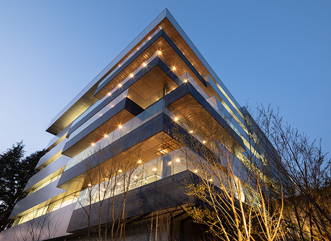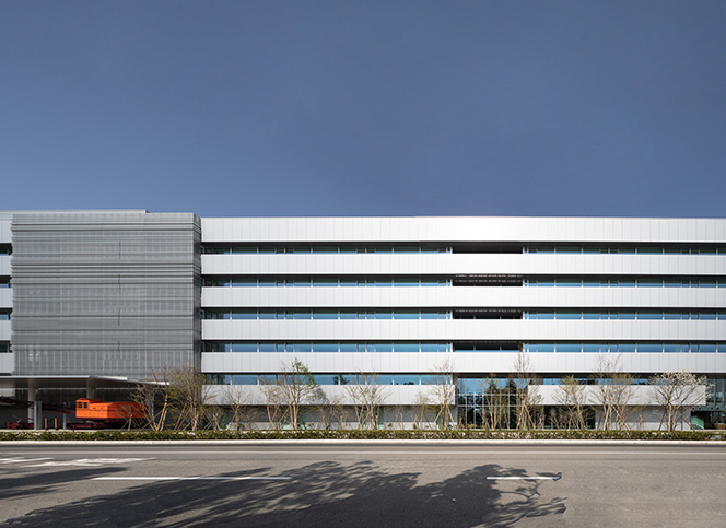 ファサードデザインはアルミパネルのバルコニー壁面と横連窓がつくる水平ラインを「地層」のように積み重ね70周年事業における歴史の堆積を表現し、バルコニーの出幅や形状はフロアごとに凹凸をつけることで、建設機械が大地を拓いた断面をイメージさせ、アクセントとしました。バルコニーの幕板や軒天のパンチングパネルは、内部の鉄骨や下地を垣間見せることで、建設機械が活躍する現場のような荒々しさに呼応するデザインとしました。