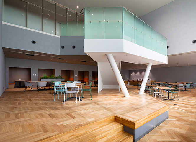 土浦工場における研究開発機能を集約し、新たな価値創造や従業員の生産性向上と社内・社外とのイノベーションを促進することを目的としたオフィス建替計画です。【多様性】【快適性】【コミュニケーション】をコンセプトとし、ネイバーフッド(部署内での最適化)の強化とABW(Activity Based Working)およびサードプレイスの場の充実をめざしています。