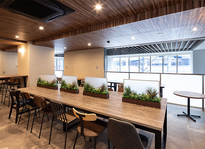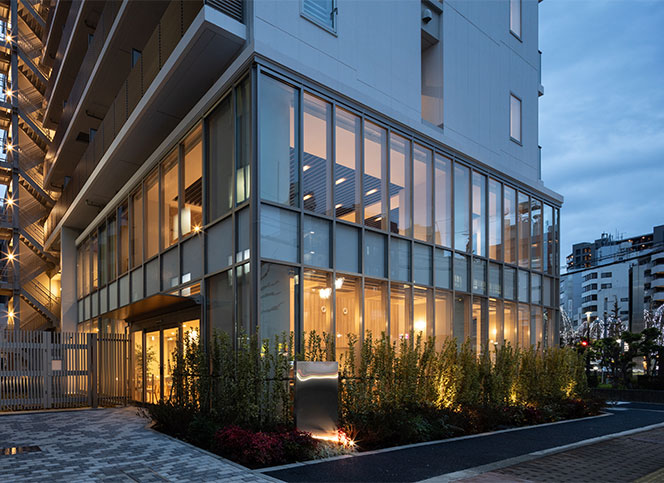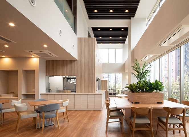 建物を南道路側に配置し、北側集合住宅への圧迫感を軽減しています。さらに、西側道路に面する低層部には1・2階を吹き抜けでつなぐシンボル的なガラスカーテンウォールの食堂を設けることで、建物と外部の相互で賑わいを受発信できるようにし、周辺地域と調和しながらもシンボル的な建物となるように計画しました。