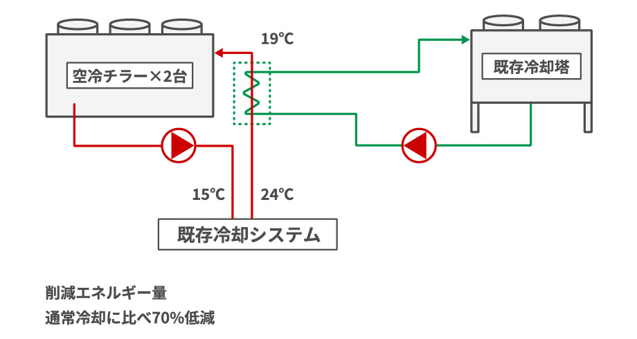 空冷チラーで冷却されている装置を、改修により不要となる冷却塔を活用しフリークーリングを行いチラー運転時間を低減する。