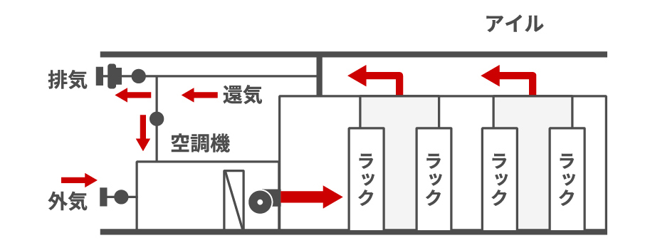 - 冷気は室内気流を乱さない置換換気空調用吹出口により超低速で吹き出され、サーバーを冷却した後、天井近くまで立ち上げた還気口に戻る。冷気と暖気の混合を最小限に抑えるために、ホットアイルをドア付パーティションで区画し、天井には簡易フードを設ける。