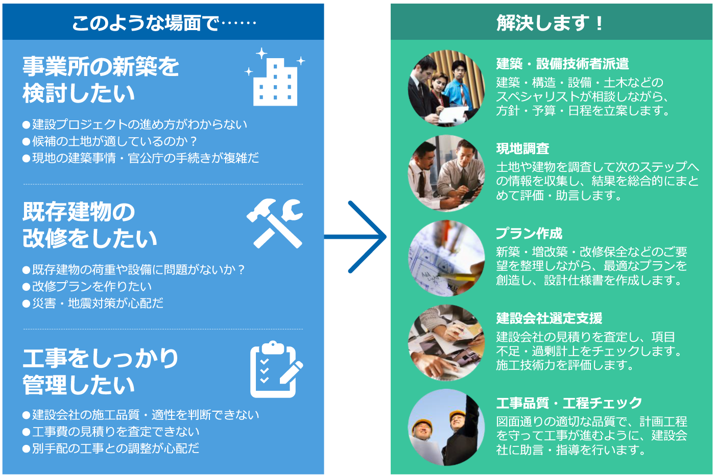 専門のスタッフを派遣し、お客さまの建設チームの一員として、計画の初期段階からトータルに建設業務を支援いたします。