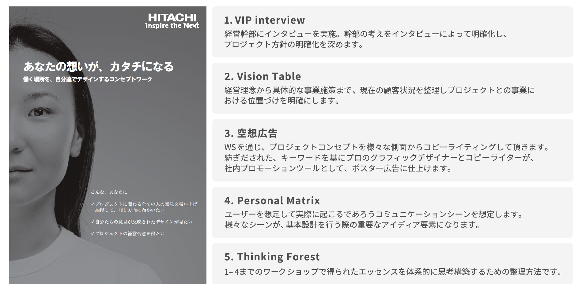 日立建設設計では、設計プロジェクトにおけるオリジナルワークショップを開発しました。お客さまが時に、コピーライターに、時には脚本家にそして一つの映画を創り出すように空間で展開される実際のシーンを想定することで、プロジェクトコンセプトの本質に迫ります。